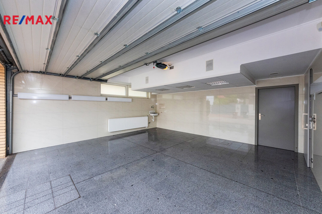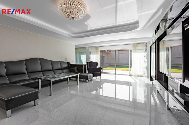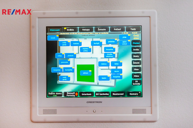 Interiér byl kompletně vyroben na zakázku a je vybaven moderními technologiemi – chytrá domácnost Crestron, centrální lux HUSKY, kamerový systém uvnitř atria včetně laserových závor kolem domu. Elektrické zámky + v každé místnosti, mimo garáže a šatny, jsou nainstalované TV. Bezpečnostní rolety, bezpečnostní ocelové vstupní dveře okna s trojsky a rámy Schüco.