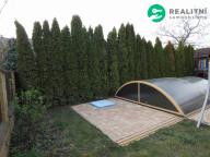 Udržovaná zahrada se zastřešeným bazénem o rozměrech 4x3m.