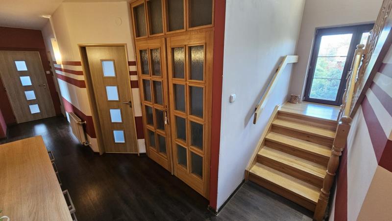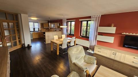 Prodej velmi pěkného - moderního rodinného domu o velikosti 5 + 1 + 2 x koupelna a WC s terasou, bazénem a zahradou na okraji městečka Rožmitál pod Třemšínem, ulice Sladkovského 761. Dům je moderně stavěný a je z roku 2020. Rožmitál p. Tř. je napojený na pražskou autobusovou integrovanou dopravu - pid. Dobré autobusové spojení na Prahu -a Příbram, dále Plzeň. U Rožmitálu začínají husté Brdské lesy. V Rožmitále p. Tř. je veškerá občanská vybavenost - obchody, škola, školka, lékař a další. Popis domu : suterén - částečně podsklepeno - kotelna a uhelna / moderní kotel ústředního topení na pevná paliva se zásobníkem /, úložné prostory a místnost pod garáží - montážní jáma. Přízemí - vstupní chodba a zádveří, velká hlavní obytná místnost s napojením na kuchyň a jídelnu a vstupem na terasu, 2 samostatné ložnice / jedna je se vstupem na terasu /, koupelna a WC, vstup do garáže - parkování na 1 auto - úložné prostory, vstup do suterénu. Podkroví - 2 samostatné velké pokoje / zatím je dodělán 1 pokoj /, koupelna a WC. Za domem je velká terasa s menším zapuštěným bazénem. Pěkná udržovaná zahrada. Celý pozemek je oplocen. Vybavenost : elektřina 220/380V, obecní vodovod a kanalizace, ústřední topení - radiátory a kotel na pevná paliva se zásobníkem. Plánky domu jsou ve fotkách. Dobré a klidné bydlení. Podrobné informace v RK. Prohlídky domu po domluvě.
