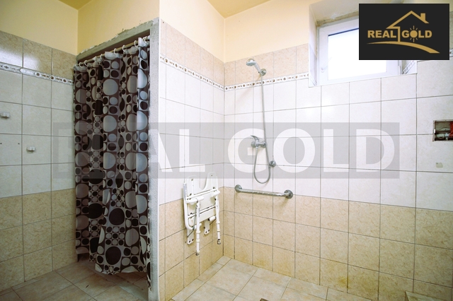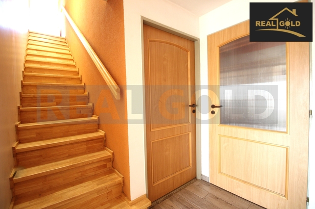 • 1. NP: garáž, prostorná krytá veranda s bezbariérovým nájezdem, vstupní chodba s dřevěným schodištěm, velký obývací pokoj s jídelnou a krbem, který navozuje útulnou atmosféru i v zimních dnech, kuchyň s moderní linkou se spotřebiči, barovým pultem, koupelna se sprchovým koutem, se dvěma umyvadly a toaletou, ložnice s šatnou, dětský pokoj, samostatné WC, komora/spíž, sklep a vstup do dvora.
