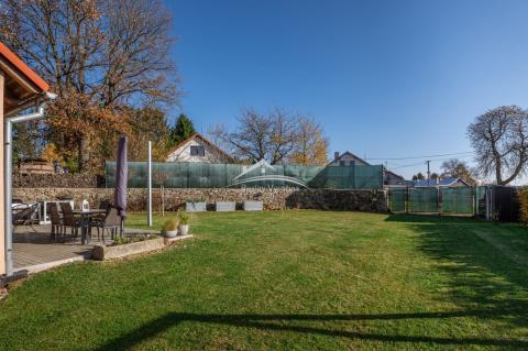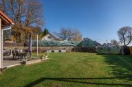 Pozemek nabízí dva samostatné vjezdy – jeden k domu a garáži, druhý do zahrady. Nachází se zde vydlážděná terasa a klidová zóna pro odpočinek na krásné udržované zahradě.