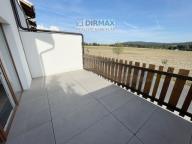 Další vstup je do velké místnosti fungující jako obývací prostor se vstupem na terasu s krásným, panoramatickým výhledem na okolí a CHKO Brdy. Soukromí je zajištěno betonovou zdí, směrem k sousedům. Terasa má vlastní odvodnění. Velká okna s tzv. francouzskými dveřmi zajišťují dostatek světla po celý den. Pod okny jsou vytápěcí rošty, zábrana před rosením.
