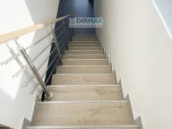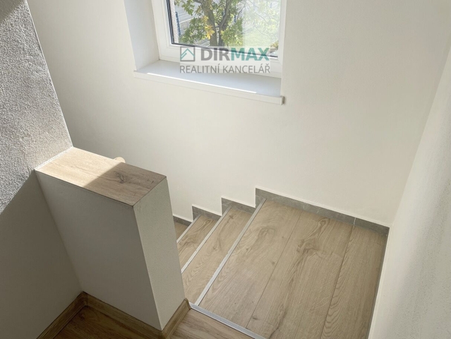 Po betonové schodišti se zábradlím a dlažebními stupnicemi se jde do 1. patra. Na konci schodiště je zábrana proti pádu, zejména ochrana pro děti nebo starší osoby. V patře je místnost pro kuchyni s jídelnou. Jsou kompletně připravené rozvody včetně odsavače par na kostru domu. V celém patře je dlažba a podlahové vytápění.