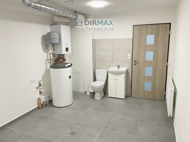 V této velké místnosti je toaleta, umyvadlo, přípojky na pračku a sušičku a prostor na umístění případné sauny i vířivky. Je provedeno odvětrání, vzduchotechnika. Je tady také vlastní vodoměr, který je umístěn přímo v domě, nikoliv venku v šachtě.