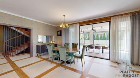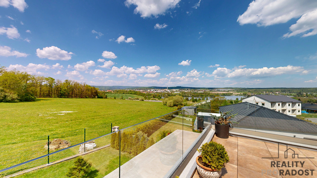 - Dvě terasy: 29,4 m² zasklená terasa (přízemí), 49,4 m² (patro)