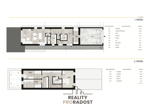 Vnitřní dispozice: 1. NP (přízemí): zádveří, obývací prostor s jídelnou a kuchyňským koutem, spíž, koupelna, šatna, technická místnost, toaleta, skladovací prostor, garáž 2. NP (obytné podkroví): chodba, 2x pokoj, ložnice s toaletou a koupelnou.