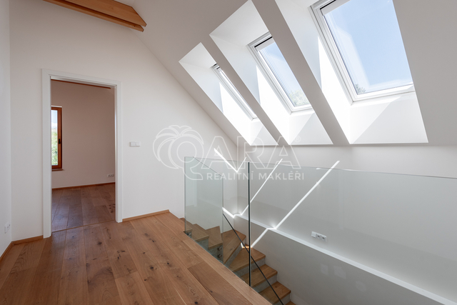Rozsáhlá terasa navazuje na obývací pokoj a jídelnu a propojuje tak dům se zahradou a bazénem. Zahrada má orientaci na jihovýchod a nabízí krásné výhledy do širokého okolí. Auta lze parkovat na uzavřené zpevněné ploše před domem. Vila byla dokončena v roce 2022 a záruky na stavební část domu jsou až do května 2027. K nadstandartnímu vybavení patří ocelová a dřevěná eurookna s izolačním trojsklem, předokenní žaluzie, kvalitní dřevěná dubová podlaha, velkoformátové moderní dlažby a luxusní sanita, stropy otevřené do krovu a vestavěné skříně.