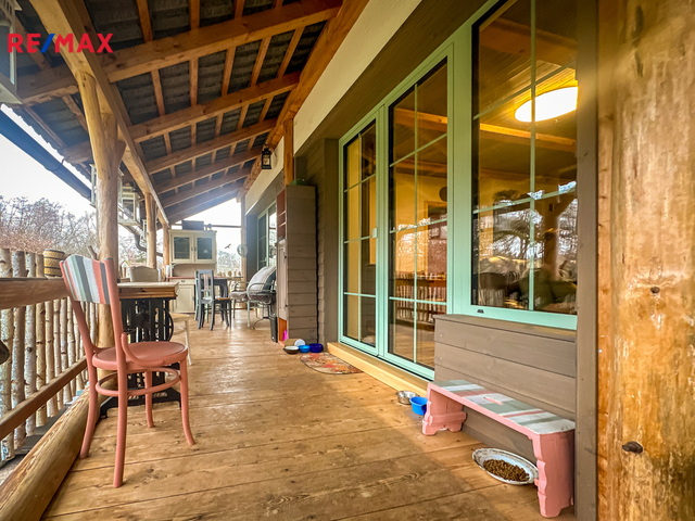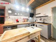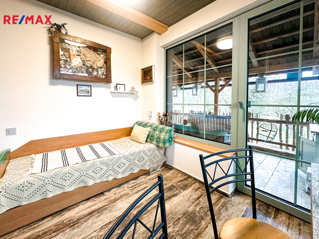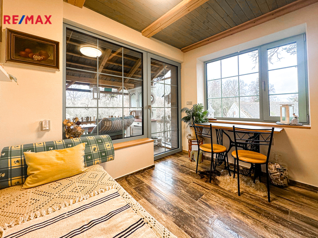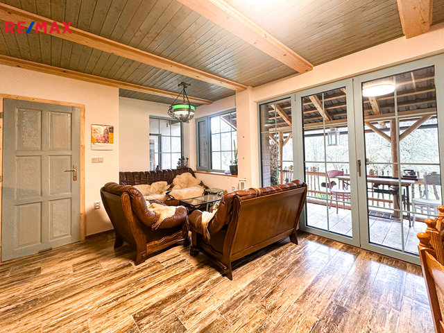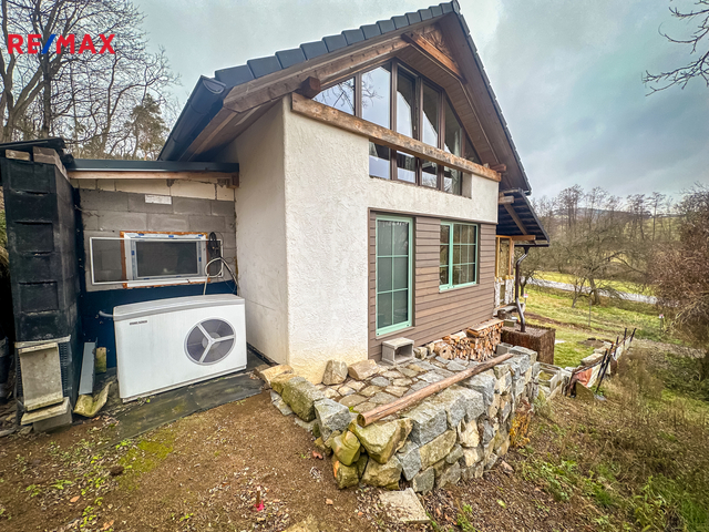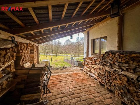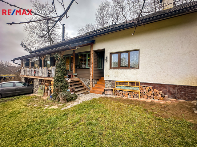 Do domu se vstupuje po několika schodech, kde se přímo dostaneme na velmi prostornou a zastřešenou terasu, kde můžete trávit spoustu času při kávě či odpočinku. Po vstupu do domu se napravo nachází velmi prostorná obytná místnost, které dominuje zcela funkční pec spolu i s kamny (nově postaveno). Prostor této místnosti se otevírá až ke krovu a po schodech se dostanete do prvního patra, kde se nachází další obytný prostor, kteří je otevřený k místnosti s pecí, dále se v patře nachází koupelna s vanou i záchodem, prostorná chodba a ložnice s velkoryse prosklenou stěnou.
