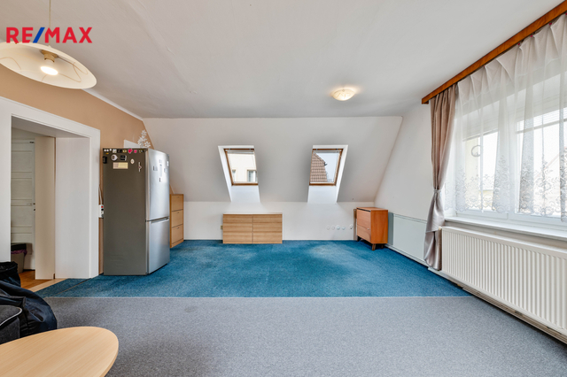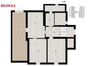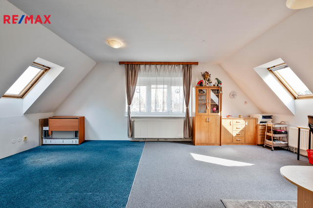 Podkroví 2+KK: 2 pokoje, kuchyňský kout, chodba, koupelna s WC, 2x komora, schodiště.