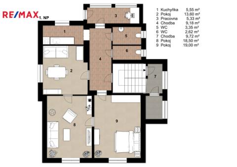 Přízemí 3+KK: 3 pokoje, kuchyňský kout, chodba, pracovna, 2x WC, schodiště do podkroví.