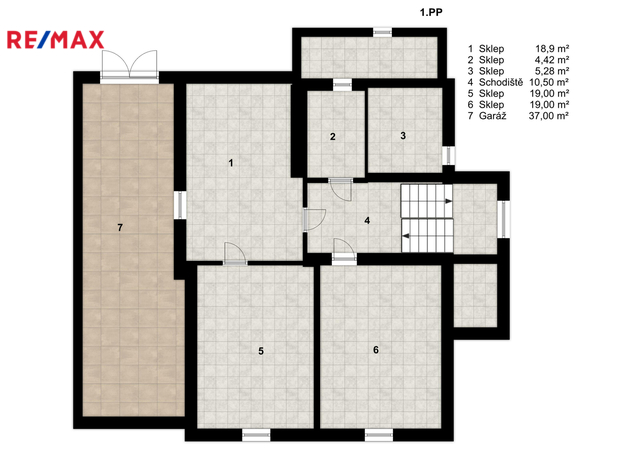 Suterén: sklepní a skladové prostory, zadní vstup.