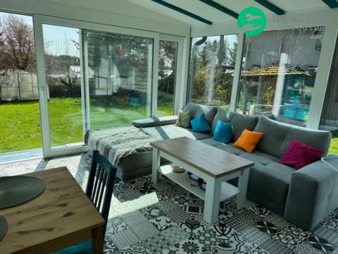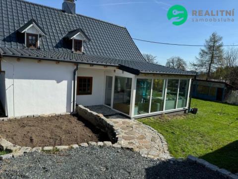 Prodám částečně vybavený rodinný dům 4+1 s velkou zimní zahradou v obci Krásné (součást obce Tři Sekery). Krytým zádveřím se vstupuje do zimní zahrady (20 m) - příjemného prostoru využitelného od jara do podzimu. Ze zimní zahrady se vstupuje do chodby k WC a koupelně, z chodby se jde také do předsíně. Z předsíně vedou schody do patra,ale též se jde do obýváku,komory a kuchyně,za kuchyní je ložnice/pokoj pro hosty. V patře jsou dvě ložnice, menší prostor nad schody a vstup na půdu. Dům má novou plechovou sedlovou střechu (jižní orientace větší části střechy je ideální pro FVE anebo solární kolektor). Pitná voda z obecního vodovodu, odpad vede do kanalizace,obec má vlastní čističku. Dům je částečně podsklepený, má studnu a venkovní posezení. Na pozemku je též prostorná kůlna i s velkým úložným prostorem na půdě. Vytápění a ohřev vody elektřinou (bojler, elektrokotel; plyn v obci není). Dům má zděný komín, po revizi lze využívat k topení. Na pozemku parkovací místo (po letošní rekonstrukci silnice nutná úprava brány). Zahradu tvoří několik záhonů a trávník Poblíž domu je zastávka autobusu (spojení do Mariánských Lázní, 9 km). Klidná obec správně spadající pod obec Tři Sekery (MŠ, ZŠ,obchod,hospoda). Obec na hranici se SRN (hraniční přechod Broumov 13 km).