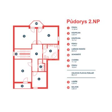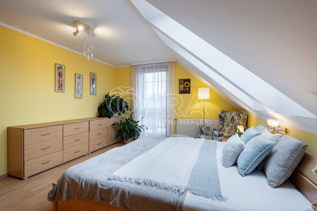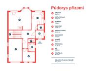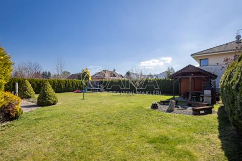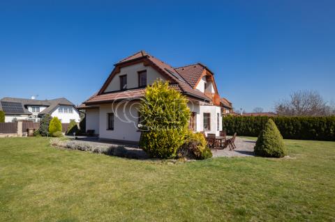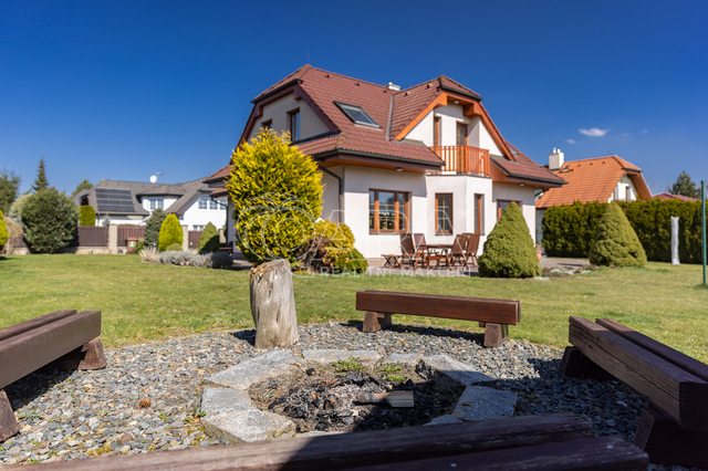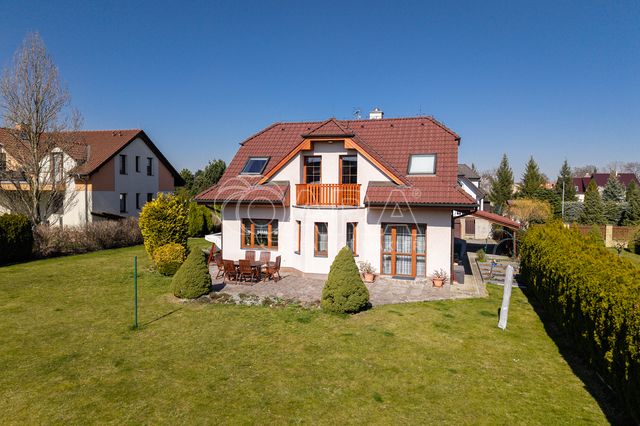 Dům z roku 2004 je dispozičně řešen jako 6+1 s garáží a je ve velmi dobrém stavu. Přízemí využíváno jako společenská zóna: obývací pokoj s krbem a navazující terasou, samostatná kuchyně s komorou, pracovna, hala se schodištěm, koupelna se sprchovým koutem a samostatné WC. V patře se nachází čistě soukromá část, kterou tvoří 4x ložnice (tři ložnice mají vstup na balkon), hlavní koupelna s vanou, sprchovým koutem a s WC, chodba a menší koupelna se sprchovým koutem a s WC. Posledním prostorem v domě je půda (úložný prostor pro lyže, kufry, sportovní vybavení a sezonní potřeby pro celou rodinu).