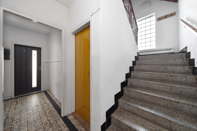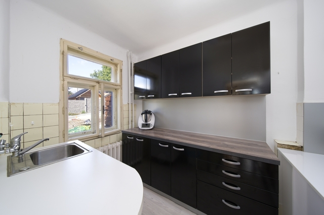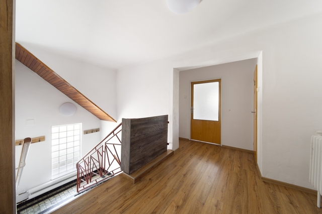 Celé přízemí je upraveno jen z části, jsou zde kvalitní, opravené parkety. Ke třem pokojů patří i samostatná a vybavená kuchyňská linka. Okna i rozvody jsou v původním, avšak zachovalém stavu. V koupelně je vana s umyvadlem. WC a spíž jsou samostné na vstupní chodbě do domu.