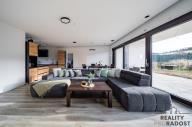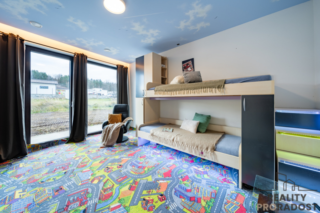 Novostavba rodinného domu 5+kk s garáží na lukrativním místě ve Včelné u Českých Budějovic. Tento dům je výsledkem architektonického studia pana Vostrackého a poznáte to zde na každém detailu. Jeho prosklená jižní část s obrovskými francouzskými okny HS-portal Vás jednoduše bude bavit. A to, jak si pan architekt pohrál s různými přesahy střechy, aby využil maximum slunečního svitu, aniž byste museli zatahovat venkovní elektrické rolety, resp. aby je chytrá domácnost od firmy LOXONE nemusela spouštět za Vás, je brilantní. Dům je prošpikovaný nejnovějšími technologiemi od této značky jako je tepelné čerpadlo (země - voda), pasivní chlazení, vynikající audio systém s reproduktory v každé místnosti, příprava na rekuperaci a příprava na ohřev bazénu a jiné. Je zde i příprava na teplovodní krb. Dispozice domu nabízí dva dětské pokoje na jedné straně, uprostřed dominantu v podobě obrovského obývacího pokoje s místem na krb se zadním přikládáním a s kuchyní a na protější straně dvě ložnice s druhou koupelnou. Dalšími benefity jsou prostorná šatna a garáž + venkovní kryté stání. Dále je potřeba zmínit vinylové podlahy, HS-portal v kombinaci dřevo-hliník ve třech pokojích se vstupem na zahradu, na střeše plastovou folii a zahradu o rozloze 611 m2, která čeká na Vaše nápady. Dům najdete ve slepé ulici s klidovou zonou s ohništěm a dětským hřištěm uprostřed, takže své ratolesti můžete bez starostí nechat řádit na ulici. V domě zbývá zbudovat krb, oplotit pozemek a dokončit zahradu dle Vašich představ. Dům se prodává v aktuálním stavu. Dle přání kupujícího může být dodána nová kuchyně, dodělána druhá koupelna, vyměněny podlahy i dodány interiérové dveře, jejichž cena není součástí kupní ceny. Více informací v RK.