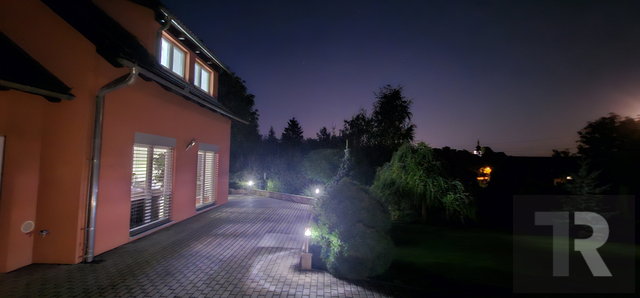 Dešťová voda svedena do 6m3 nádoby na vodu s dvěma pilíři na zalévání zahrady. Zároveň je k dispozici studna bez napojení do domu s dobrou vydatností vody pro zalévání zahrady.