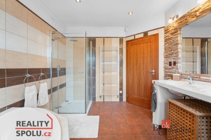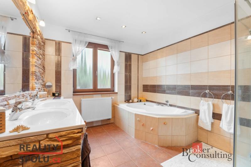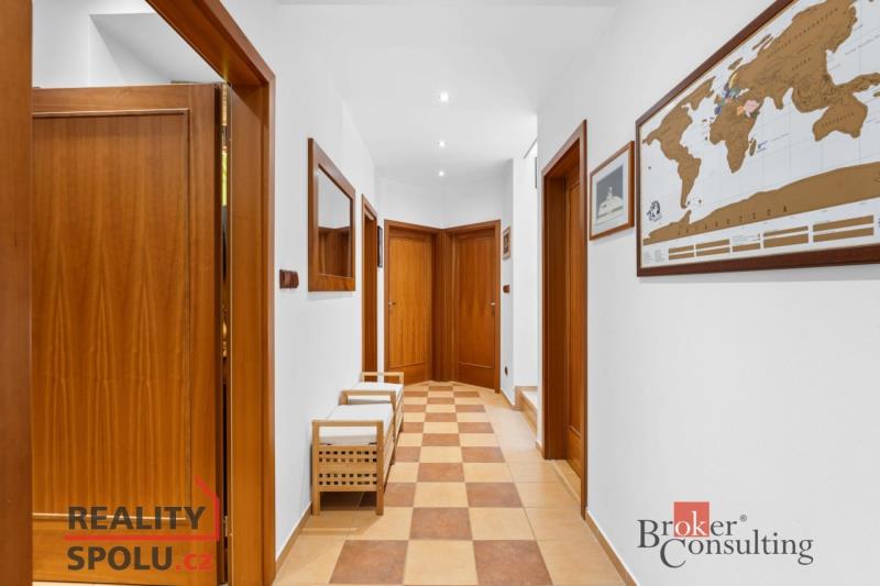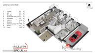 V přízemí se nachází předsíň s velkou vestavěnou skříní a technickou místností, velký obývací pokoj s krbem, plně vybavený kuchyňský kout s jídelní částí, ložnice a moderní koupelna s vanou, sprchovým koutem a samostatnou toaletou. V přízemí je jak podlahové topení, tak radiátorové. V 1. podlaží naleznete 4 pokoje, koupelnu s vanou a toaletou.