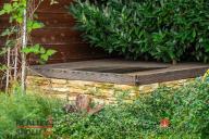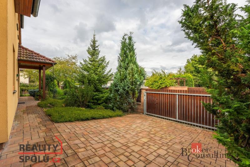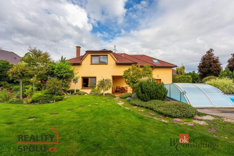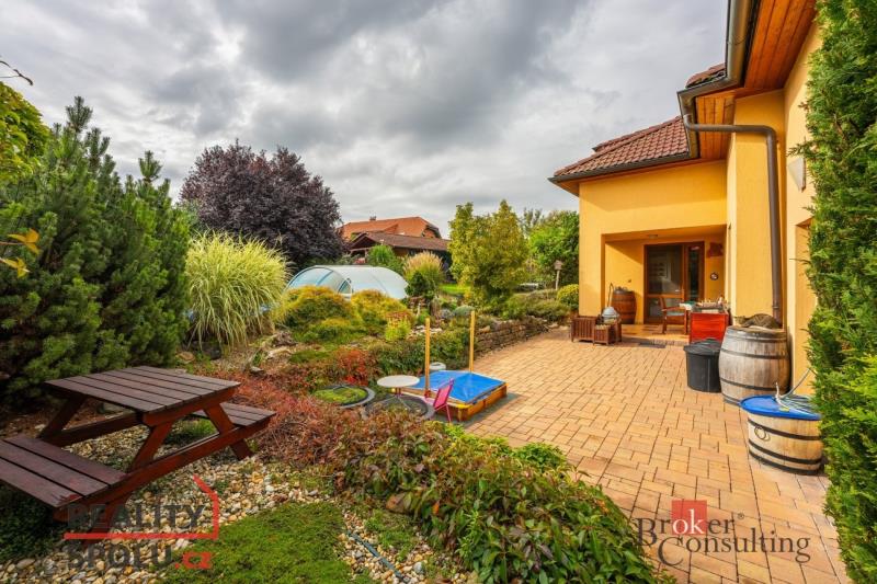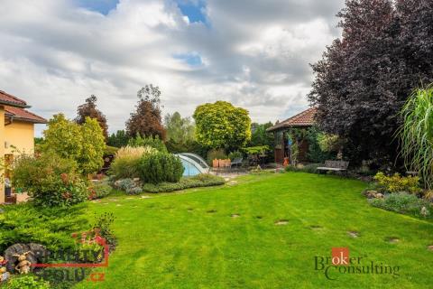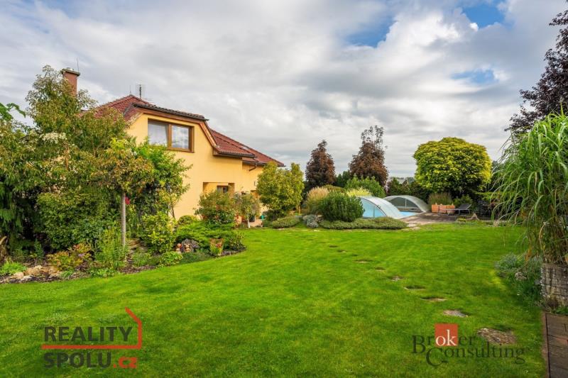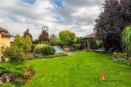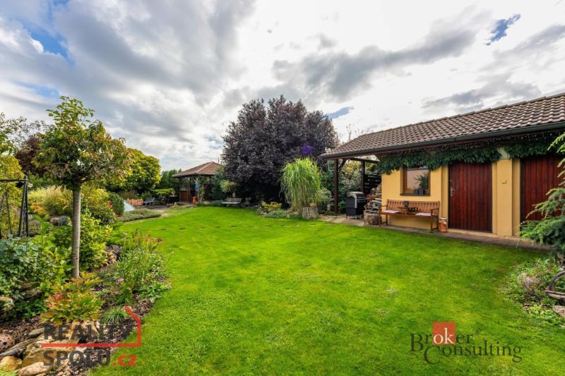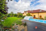 Na okrasné, prostorné zahradě se nachází pergola s krbem, studna, jezírko se skalkou, zastřešený a vyhřívaný bazén, samostatně stojící dílna, parkovací stání a garáž, která je součástí stavby, vše zajištěno zabezpečovacím systémem.