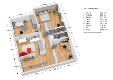 2.NP: schodiště - 5,63 m², podesta - 7 m², chodba - 8,19 m², pokoj - 15,75 m², pokoj - 15,75 m², pokoj - 11,75 m², sprcha - 3,7 m², wc - 2,4 m², pokoj - 19 m². Celková výměra - 89,17 m².