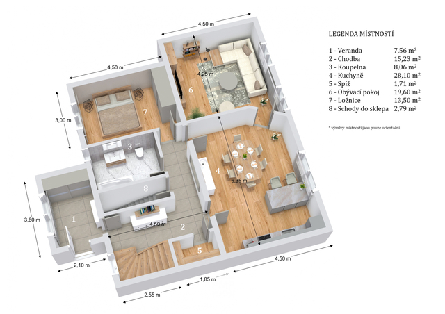 1.NP: veranda - 7,56 m², chodba - 15,23 m², koupelna - 8,06 m², kuchyně - 28,1 m², spíž - 1,71 m², obývací pokoj - 19,6 m², ložnice - 13,5 m², schodiště - 2,79 m². Celková výměra - 96,55 m².
