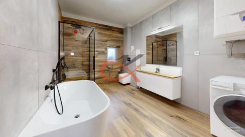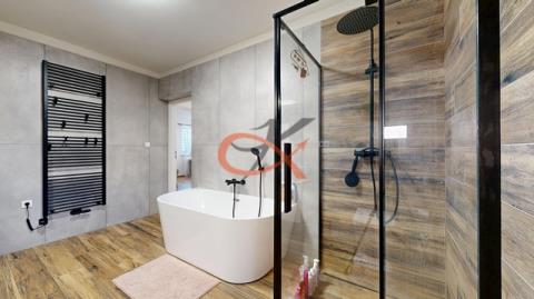 V přízemí se nachází stylová koupelna s vanou i sprchovým koutem, a samostatné WC. Nové interiérové dveře, obložky a vhodně zvolené LED svítidla přidávají interiéru na moderním vzhledu.