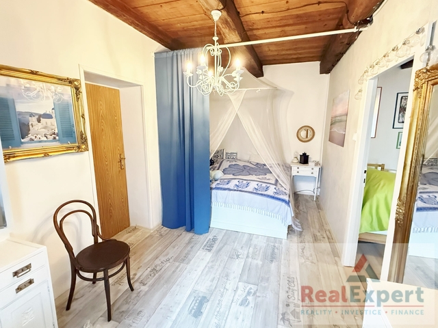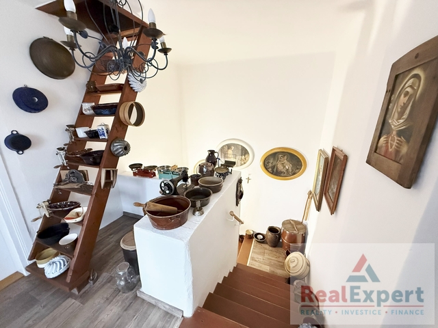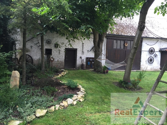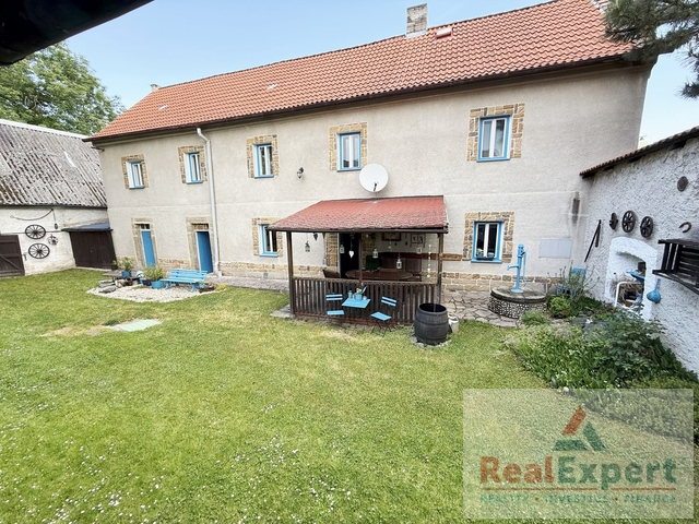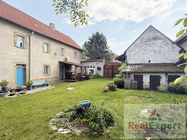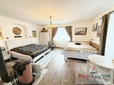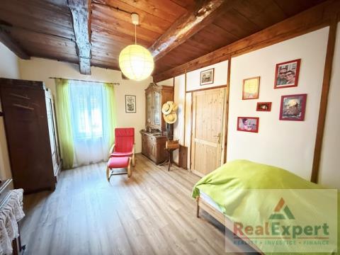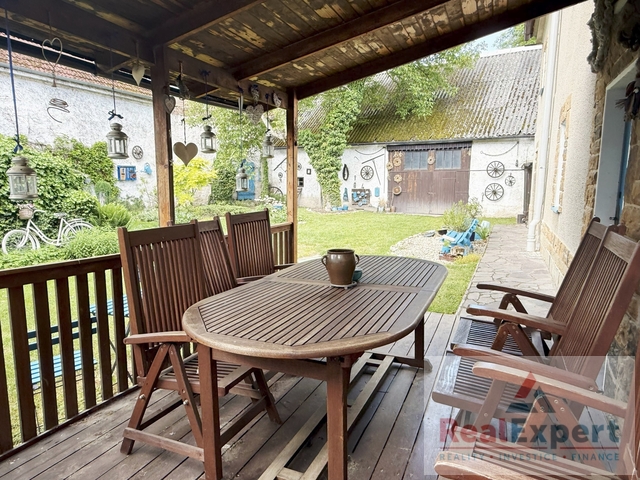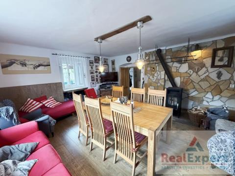 Dvoupodlažní dům o dispozičním řešení 5+1 (zastavěná plocha 19,5 x 6,8 m), s užitnou plochou cca 200 m² (+prostorná půda) a tradiční architekturou prošel v minulých letech citlivou rekonstrukcí, která zachovala původní ráz stavby. Najdete zde 4 prostorné pokoje (ložnice), stylový obývací prostor s jídelnou a krbovými kamny, vybavenou kuchyni, koupelnu a WC. Interiér spojuje přirozené materiály a moderní pohodlí – dřevěné podlahy, dekorativní trámy i výhled do zeleně. K dispozici je dále dílna, sklípek a garáž (6x3 m)