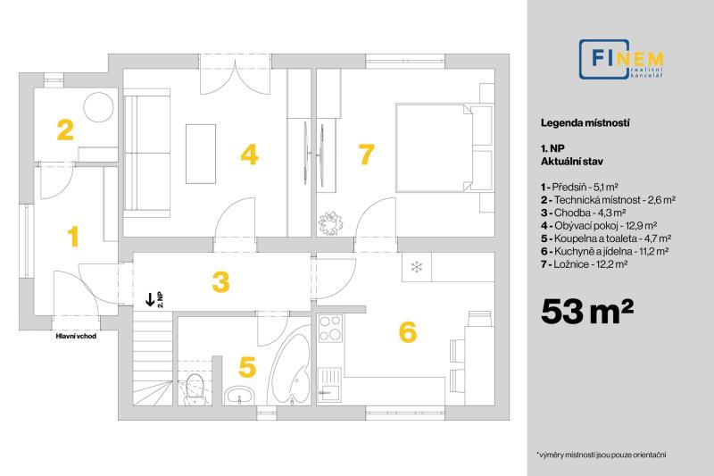 Nabízíme k prodeji samostatně stojící rodinný dům se zahradou 746 m² v obci Všestudy. Dům se nachází v klidné lokalitě v blízkosti přírody a zároveň nabízí velmi dobrou dostupnost do okolních měst. Pozemek je oplocený a poskytuje dostatek soukromí i prostoru pro odpočinek. Užitná plocha domu činí přibližně 85 m². Celková výměra pozemku je 843 m², z čehož zahrada tvoří 746 m². Vstup do domu vede do zádveří. Odtud je přístupná technická místnost s plynovým kotlem. Ze zádveří se dále vstupuje do centrální chodby. Z chodby je vstup do kuchyně, koupelny s vanou a toaletou a do obývacího pokoje. Obývací pokoj je světlý. Má přímý vstup na zahradu přes francouzské okno, díky tomu je interiér příjemně propojený se zahradou. Kuchyně je samostatná místnost, je vybavena kuchyňskou linkou na míru, plynovým sporákem a pračkou. Navazuje na ni ložnice orientovaná do klidnější části domu. Z chodby vede schodiště do podkroví. Je zde počítáno s vybudováním dvou obytných místností a samostatné toalety. Prostory jsou připravené k dokončení dle vlastních představ. Z podkroví je přístupná také půda, která slouží pouze jako menší úložný prostor. Dům je napojen na obecní vodovod, kanalizaci, elektřinu i plyn. Vytápění zajišťuje plynový kotel. Okna jsou plastová. V obytných místnostech jsou plovoucí podlahy, na chodbě a v koupelně je dlažba. Dům je plně funkční a připravený k nastěhování. Na pozemku se nachází garáž s dílnou a zahradní domek. Parkování je možné na pozemku i před domem na nově vybudovaných veřejných parkovacích stáních. Obec Všestudy je klidná a neprůjezdná. Nachází se zde samoobsluha, fotbalové a dětské hřiště, autobusová zastávka s přímým spojením do Kralup nad Vltavou i do Prahy na metro C Kobylisy. Obec se navíc postupně rozrůstá a vzniká zde nová rezidenční čtvrť, což z ní činí perspektivní lokalitu vhodnou pro dlouhodobé bydlení i investici. Velkou výhodou je blízkost zámeckého parku ve Veltrusech. Park je vzdálen jen několik minut a nabízí rozsáhlé zelené plochy, aleje, kavárnu a prostor pro sport i procházky. Do Kralup nad Vltavou se dostanete přibližně za 10 minut jízdy. Město nabízí kompletní občanskou vybavenost, parkovací dům a výborné vlakové spojení do centra Prahy. Cesta vlakem na Masarykovo nádraží trvá zhruba 35 minut. Do Mělníka je dojezd přibližně 20 minut. Nájezd na dálnici D8 je vzdálen zhruba 5–10 minut jízdy. Obchodní zóna v Kozomíně je vzdálena přibližně 8 km, tedy zhruba 10 minut jízdy autem. Nachází se zde supermarkety, drogerie, lékárna, elektro, hobby market, restaurace a další služby. Nemovitost je možné financovat hypotečním úvěrem. S jeho vyřízením Vám rádi pomůžeme. Více informací a kompletní prezentaci nemovitosti najdete na webové prezentaci: vsestudy.finemreality.cz V případě více zájemců bude nemovitost prodána nejvýhodnější nabídce. FINEM – REALITY s.r.o. | osobní a férový přístup
