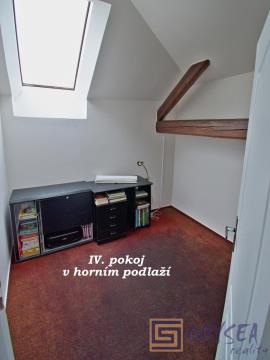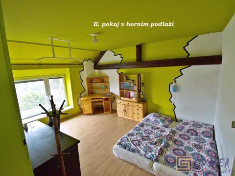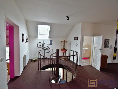 V horním podlaží je k dispozici opět zajímavě řešený obytný prostor - vstupní hala plynule přechází ve velký obývací pokoj se stylovým krbem, z tohoto pokoje vedou dveře do dalších čtyřech neprůchozích pokojů (viz fotogalerie). Součástí horního podlaží je samozřejmě taky koupelna s toaletou.