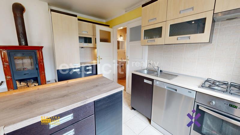 Kuchyně je vybavena kuchyňskou linkou se spotřebiči (myčka, sporák s troubou) a rustikálním jídelním koutem. Dominantou prostoru jsou funkční kachlová kamna, která dodávají domu příjemnou venkovskou atmosféru. Na kuchyni navazuje praktická komora s lednicí a suchým skladem potravin, a dále koupelna se sprchovým koutem. Z kuchyně se vstupuje do obývacího pokoje s TV stěnou, který je průchozí do hlavní ložnice vybavené šatní skříní a manželskou postelí. V druhé části domu se nachází další samostatný pokoj s vlastní koupelnou (s rohovou vanou) a komorou.