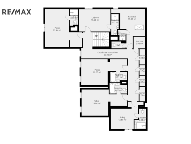 2.NP: 5x ložnice, přičemž každá má vlastní koupelnu s vanou nebo sprchovým koutem a WC, kancelář s vlastní koupelnou, WC a vstupem na půdu, 5x komora.