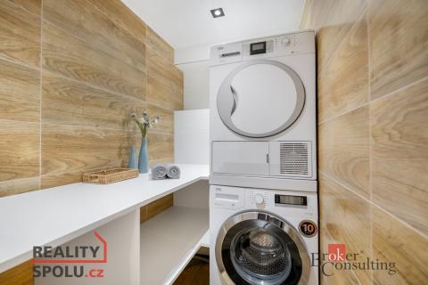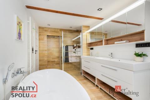 Přímý vjezd, dálkově ovládaná brána, připojení na kanalizaci, obecní i vlastní zdroj vody, internet. Na každém podlaží ovládání topení zvlášť, v koupelně topný žebřík. Fasáda modřín, podlahy vinyl, střešní okna Velux.