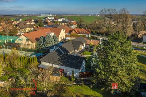 Dispozice domu: na přízemí se nachází vstupní hala, koupelna s vanou, sprchovým koutem, toaletou s umyvadlem, dvěma ložnicemi, kde každá disponuje prostornou vestavnou šatní skříní. Světlý obývací pokoj s jídelnou je útulný i díky krbovým kamnům, navazující kuchyň umožňuje propojení s obývacím pokojem, je zde i prostorný špajz. Z kuchyně je přímý vstup na terásku za domem, kde lze ráno ráno posnídat. Hlavní venkovní sezení je situované u obývacího pokoje v zahradě. Samostatně přístupná technická místnost, která slouží i jako prádelna, s pračkou a se sušičkou je hned vedle garáže (22 m2). Do patra se dostaneme po točitých schodech, tuto část majitelé využívají pro relaxaci. Najdeme zde velkou koupelnu s toaletou, se sprchovým koutem, saunou, odpočívárnu a prostornou pracovnu s fitness koutem.