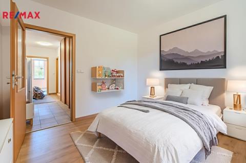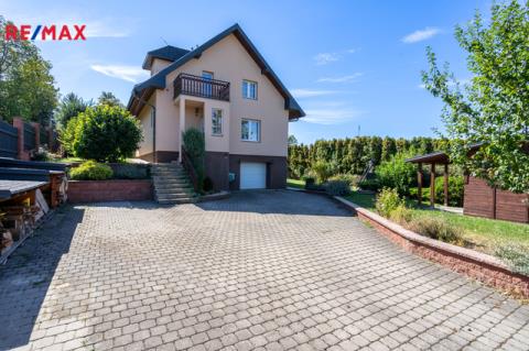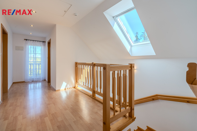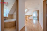 Dostatečný prostor domu, obytná plocha 189m2, 4 pokoje, obývací pokoj a kuchyň, dvě koupelny, spíž, garáž, prostorná terasa (22,21m2) s venkovním krbem, dostupná z obývacího pokoje, balkon v druhém podlaží (4,41m2), odkud je nádherný výhled do krajiny.