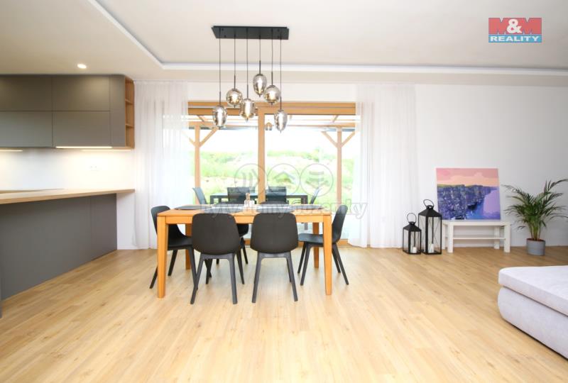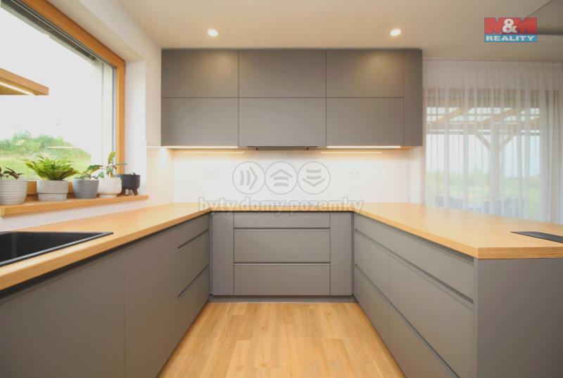 Prodej novostavby zděného rodinného domu na pozemku o rozloze 955 m² v klidné okrajové části Rychnova nad Kněžnou. Dům byl zkolaudován v roce 2023 a nabízí nadstandardní bydlení. V přízemí disponuje kuchyňským koutem propojeným s prostorným obývacím pokojem, ze kterého je vstup na krytou terasu, pokojem, koupelnou s vanou, samostatným WC, komorou a skladem s venkovním vchodem. V patře je pokoj 25 m², který lze rozdělit příčkou a vzniknou tak dvě místnosti o velikosti 12 m², každá s vlastním vstupem. Dispozičně se pak dům změní na 5+kk. Dále ložnice a koupelna se sprchovým koutem a toaletou. Dům má podlahové vytápění ve všech místnostech, přípravu na centrální vysavač a rozvody na ovládání venkovních elektricky posuvných žaluzií. Parkování je kryté až pro 3 osobní automobily. V interiéru domu je třeba dokončit jen několik drobností. Pozemek je nutno dobudovat dle vlastních představ včetně oplocení. Vybavení domu lze po dohodě částečně ponechat. Více informací u makléře. S financováním