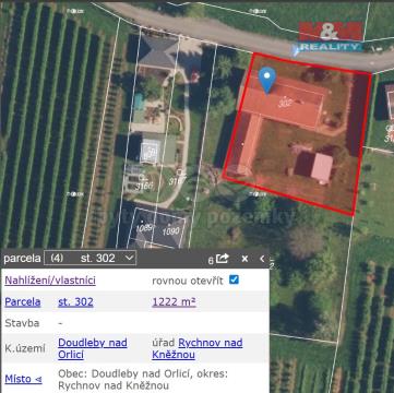 Nabízíme Vám ke koupi rodinný dům z první poloviny 20. století, který se nachází v krásném prostředí Podorlicka v Doudlebách nad Orlicí. Nemovitost se nachází v klidné části na konci slepé ulice v blízkosti řeky Divoké Orlice. Celková plocha pozemku včetně zastavěné části je 1.222 m2. Pozemek je udržovaný, rovinatý a připravený na vybudování vašeho nového domova či k rekreaci. Rodinný dům je převážně v původním stavu a jsou zde 3 obytné místnosti o ploše cca 65 m2, dále navazující stodola o velikosti cca 70 m2 ( s možností přebudování na další obytné místnosti), dále dílna cca 40 m a také podkroví. Celková užitná plocha do je přibližně nyní 175 m2. Dispozice je ideální pro jednotlivce, nebo rodinu, kteří hledají útulný a pohodlný domov. Na pozemek je přiveden veřejný vodovod, veřejná kanalizace, plyn a studna o hloubce 4 metry s užitkovou vodou. Elektřina je přivedena do domu. V pěším dosahu nalezneme kompletní občanskou vybavenost Městysu. Více informací u makléře.