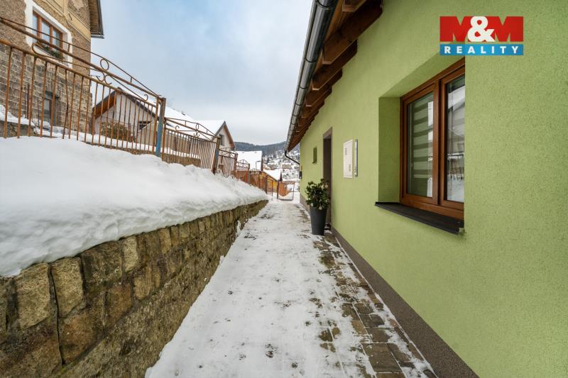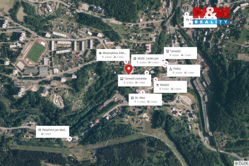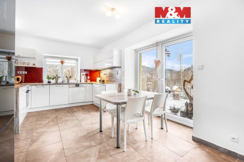 Prostorný dům 5+kk v Tanvaldu zaujme vkusem, atmosférou a výhledem na hřeben lesa. Bezbariérové přízemí nabízí vstup, chodbu, ložnici, pokoj a koupelnu s vanou a WC, podlahové vytápění v chodbě, kuchyni, obýváku a koupelně, ostatní pokoje v přízemí i podkroví mají radiátory. Obývací pokoj s kuchyní na zakázku a jídelním koutem se otevírá na terasu pro ranní kávu, relaxaci a západy slunce. Po dřevěném schodišti se dostanete do podkrovního patra se dvěma velkými pokoji, v jednom jsou rozvody pro kuchyň, což nabízí dvougenerační bydlení, dále koupelna se sprchovým koutem a WC. Dům prošel postupnou rekonstrukcí, zateplení fasáda před 5 lety, ohřev vody bojlerem, vytápění tepelným čerpadlem s akumulační nádrží a možností krbu. Parkování pro tři auta, zahrada s geometrickým rozdělením nabízí pergolu, dílnu a prostor pro výměnek, malý sklep a půdní prostor. Přes blízkost vlakové zastávky je uvnitř ticho, cesta kolem domu pouze pěší s omezeným vjezdem. Přijďte a pocítíte, že tu chcete žít!