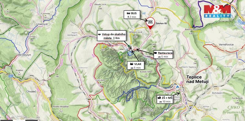 Nabízíme k prodeji dům v malebném prostředí Adršpašsko-teplických skal v obci Zdoňov, pouhé 3 km od vstupu do Adršpašských skal. Nemovitost má velký potenciál pro vlastní rekreaci i jako výnosná investice a dlouhodobě generuje stabilní zisk z ubytování. Dům nabízí dva vybavené čtyřlůžkové apartmány, a další ložnice s celkovou kapacitou více jak 20 lůžek. K dispozici jsou tři koupelny, společenská místnost, venku pak posezení s udírnou a velká zahrada. Výměra parcely je 3631 m². Součástí je garáž, sklep a kůlna. Na pozemku je vlastní studna a dům je zároveň připojen na vodovod. Místo nabízí jedinečnou atmosféru, čistou přírodu a celoroční turistický ruch, což z této nemovitosti dělá skvělou příležitost pro podnikání i pohodový život v jedné z nejkrásnějších částí Česka. Kontaktujte nás pro více informací a domluvení prohlídky.
