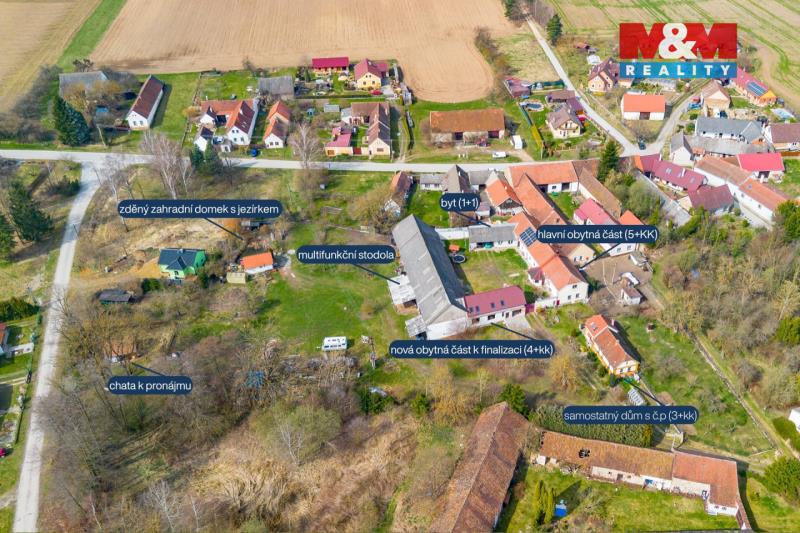 Nabízíme unikátní areál s uzavřeným dvorem a několika budovami, vhodný pro vícegenerační bydlení, podnikání, workshopy, pořádání svateb či pro hospodářské využití. Hlavní budova 5+kk prošla rekonstrukcemi od roku 2006, poslední dokončení jednotky 1+1 proběhlo v roce 2025.Nad hlavní budovou se nachází podkrovní prostor vhodný k vybudování další obytné části pro další rozvoj. Součástí dvora je multifunkční stodola vhodná pro dílnu, sklad, podnikání i chov hospodářských zvířat. Na dvůr navazuje nově postavený dům ve fázi hrubé stavby 4+kk s garáží, připravený k dokončení. Areál dále zahrnuje samostatný rodinný dům s vlastním číslem popisným o dispozici 3+kk, který je vhodný k pronájmu nebo může sloužit pro další bydlení. Dále dvě chaty – obytnou k pronájmu a zahradní s jezírkem. Celý pozemek tvoří funkční celek, je však možné rozdělení, kde mohou vzniknou samostatné stavební pozemky. Pro více informací nás neváhejte kontaktovat.