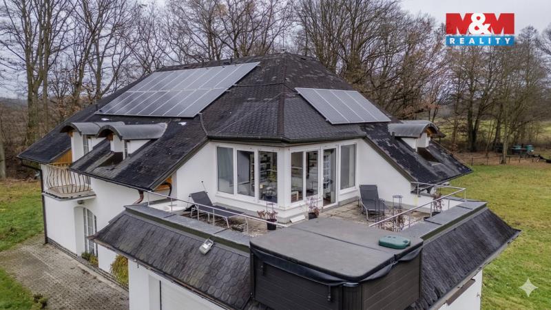 K prodeji nabízíme výjimečnou nemovitost v absolutním soukromí s výhledem na Holanský rybník. Tato luxusní vila je obklopena rozlehlým pozemkem o výměře 5008 m2. Nemovitost se nachází v blízkosti CHKO Kokořínsko, nedaleko je také Máchovo jezero. Chytrá domácnost značky LOXONE (celý dům lze ovládat z mobilu) - tepelné čerpadlo země-voda - 15 kW fotovoltaické panely a 30 kW bateriové úložiště - podlahové vytápění napojené na krbová kamna s výměníkem - akumulační nádrž na teplou vodu o objemu 4000 l - kamerový systém - stmívatelné LED osvětlení - samostatné reproduktory ve všech prostorách. Dispozice přízemí: - garáž pro dvě auta, prostor propojující kuchyň, jídelnu a obývák - hala s vnitřním bazénem, vířivkou, saunou - tech. místnost a samostatné WC Dispozice patra: - chodba formou galerie - 3 pokoje se samostatnými koupelnami, WC a balkonem - zasklená zimní zahrada - terasa se zabudovanou vířivkou