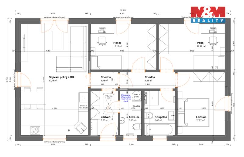 Váš nový domov na klíč – Třemošná, Záluží (Plzeň-sever) Toužíte po vlastním domě bez starostí? Nabízíme vám jedinečnou příležitost: projekt moderního rodinného domu na klíč na pozemku o velikosti 462 m² v klidné části obce Třemošná – Záluží, jen 10 minut od Plzně. Tento projekt zahrnuje: stavební pozemek s rovinatým terénem a přístupem z obecní komunikace inženýrské sítě na hranici pozemku možnost zastavění až 35 % plochy výstavbu přízemního nebo patrového domu bez omezení vzhledu garáž pro osobní automobil a pergolu pro zahradní posezení již na pozemku možnost výstavby domu pro trvalé bydlení i rekreační účely Dispozice domu – 4+kk s technickým zázemím: Dům je navržen jako komfortní jednopodlažní stavba s důrazem na funkčnost, světlo a pohodlí. Centrální část tvoří prostorný obývací pokoj s kuchyňským koutem (30,11 m²), ideální pro rodinný život i společenské chvíle. Dále jsou k dispozici tři samostatné pokoje (každý 12,82 m²), vhodné jako ložnice, dětské pokoje.