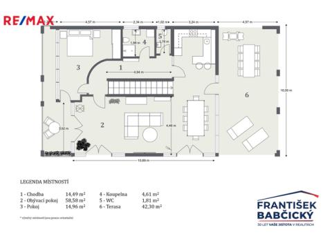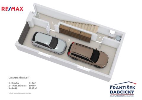 V přízemí se nachází hlavní vstup, dvougaráž, sklepní prostor s kompletní technologií domu a schodiště do obytné části domu. První nadzemní podlaží tvoří prostorná chodba a velkorysý obývací prostor s krbem a kuchyňským koutem. Odtud je přímý vstup do zimní zahrady, na terasu a dále do zahrady s bazénem. V této úrovni je dále situována ložnice, koupelna a samostatná toaleta.