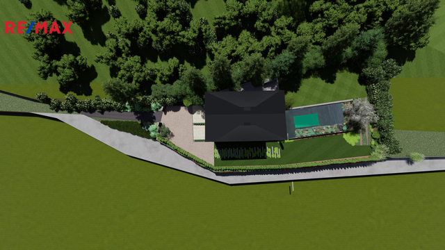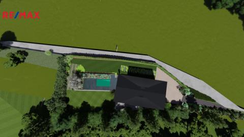 Celková výměra pozemků činí téměř 2 700 m2. Přibližně polovina pozemku bezprostředně navazuje na dům a je určena pro plnohodnotné využití jako zahrada a relaxační zázemí, zatímco druhá část má díky svému tvaru spíše doplňkový charakter a přispívá především k pocitu prostoru a soukromí. U domu je plánována relaxační zóna s bazénem o rozměrech 6 × 3 m s protiproudem, TČ, solanizátorem, automatickým hlídáním PH, který navazuje na terasy a zimní zahradu.