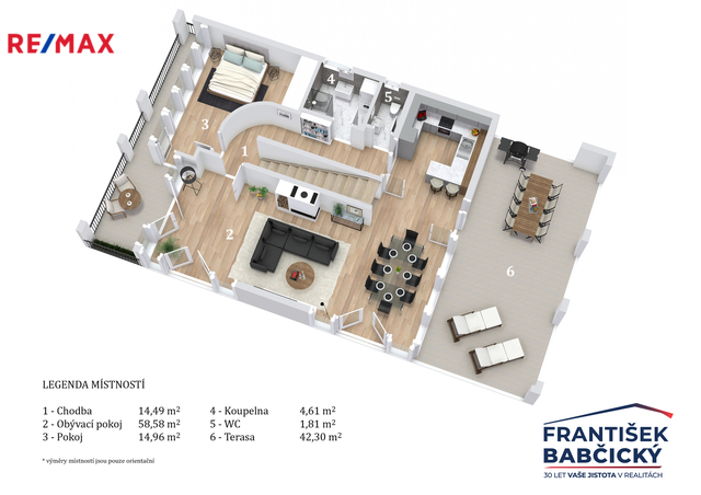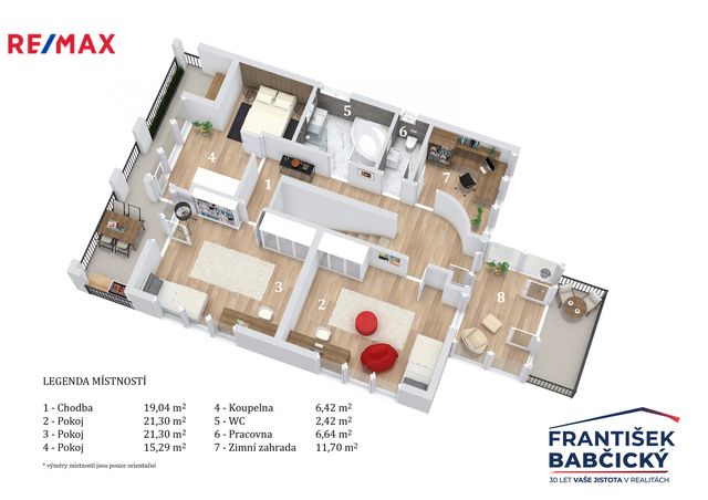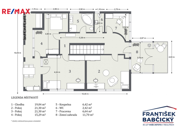 Ve druhém podlaží je další prostorná chodba, koupelna, samostatné WC, pracovna a ložnice. Dominantou patra je velký variabilní prostor, který lze rozdělit na další pokoje, případně ponechat jako otevřenou hernu, pracovnu či společenskou místnost. Také z tohoto podlaží je přístup do zimní zahrady a na terasu. Celková obytná plocha domu je 200 m2, přičemž další významnou přidanou hodnotu tvoří uzavřená zimní zahrada o výměře cca 40m2 a venkovní terasy rozšiřující obytný prostor směrem do exteriéru.