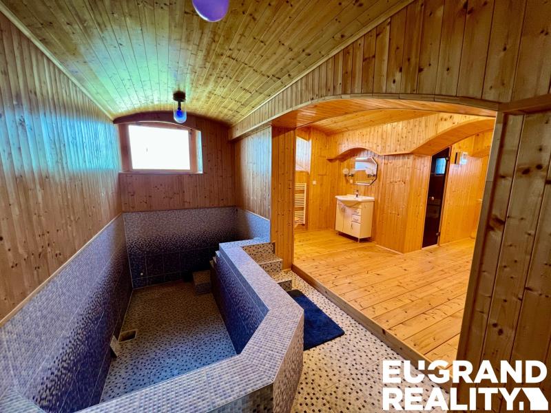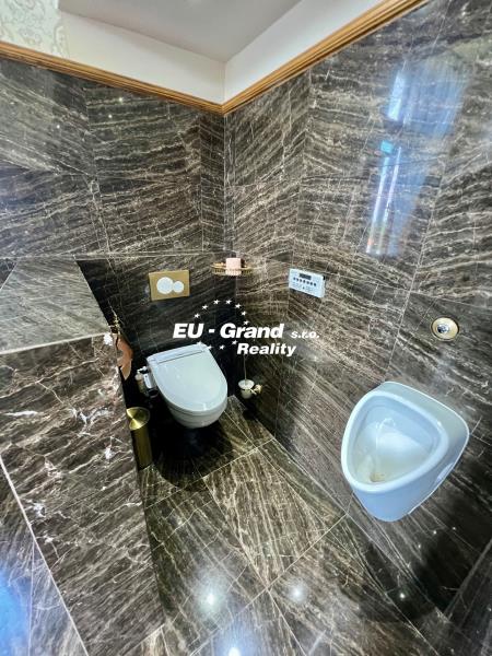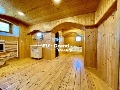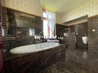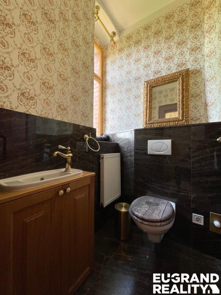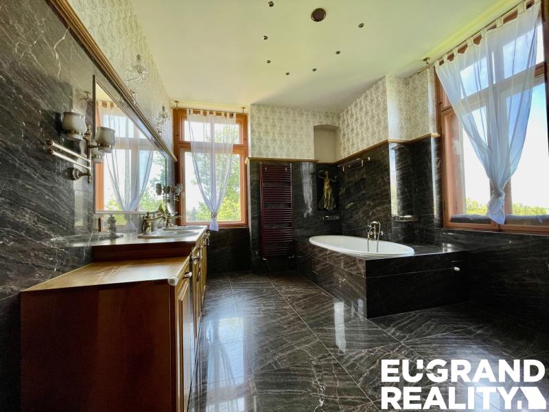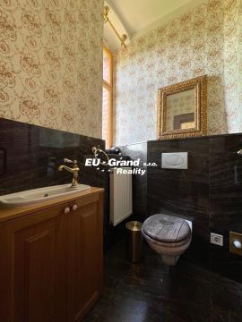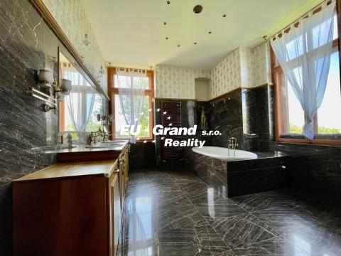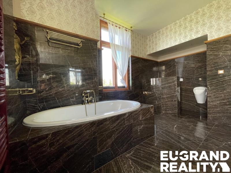 Z hlavní haly v 1. NP se projde do prostorné koupelny, která je jako spodní koupelna z mramoru se stylovými doplňky, s vestavěnou vanou s japonským záchodem, pisoárem. Z koupelny se jde po schodech do 2. NP podkroví.