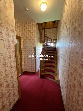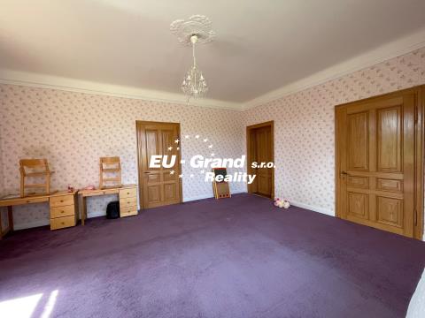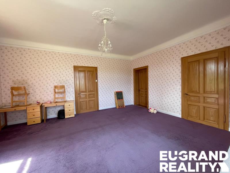 Do prvního patra se dostaneme po prostorném schodišti. Zde se nachází 4 prostorné obývací pokoje. Nyní pokoje slouží jako dětský pokoj s vlastní terasou a zasklenou zimní zahradou, druhý dětský pokoj, kterým se dá i kompletně procházet do všech místností (taktéž jako v přízemí), poté je ložnice, která je s velkou terasou a poslední je hostinský pokoj.