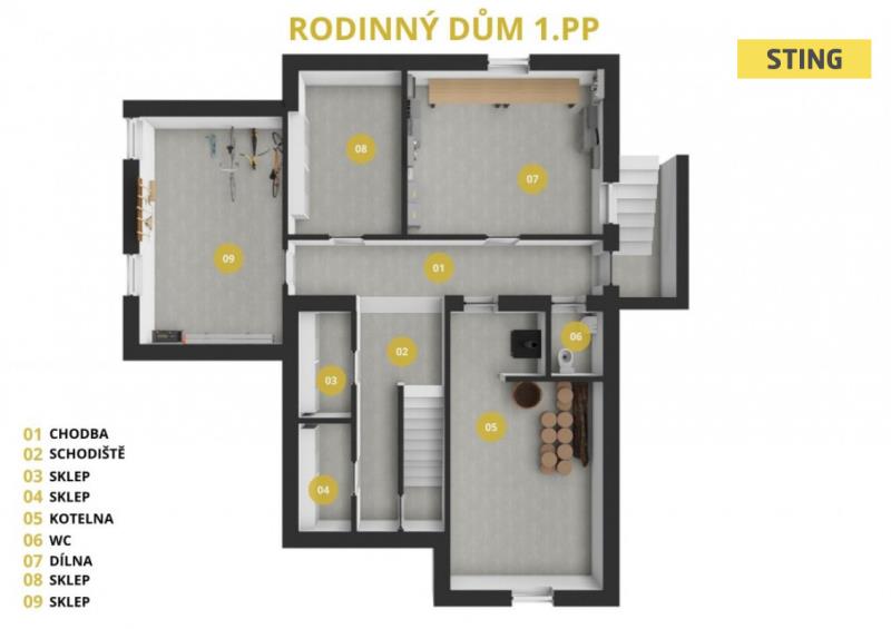 Suterén: Tři velké místnosti (dílna/sklad), dvě menší místnosti, kotelna, toaleta a přímý vstup na zahradu.