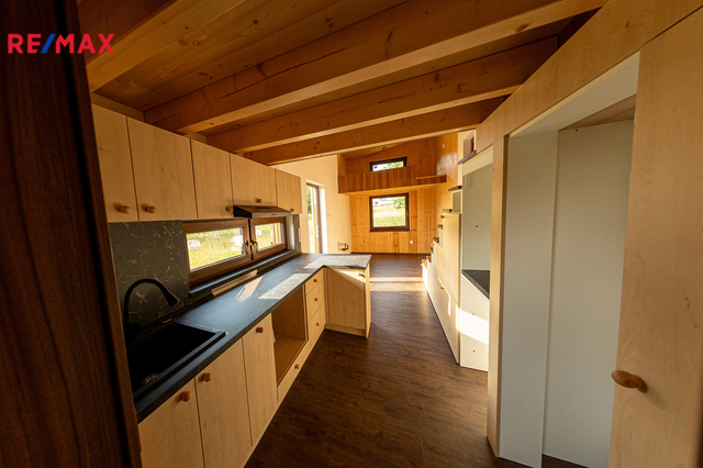 Tiny house. Nový, nikdy neobývaný. Majitel si nechal vyrobit dům pro sebe, tzn., že na materiálech se opravdu nešetřilo. Izolace - 16 cm kamenné vaty ve stěnách, 20 cm v podlaze i stropu Okna - trojskla na všechny světové strany Kuchyně - dostatek úložného prostoru a možností připojení indukční ploténky. Koupelna - sprchový kout a kamenné umyvadlo Dva lofty na spaní - pohodlně se vyspí 4 lidé Podlaha z vinylu, schody s podsvícením, bojler na teplou vodu, střešní okno s přístupem na střechu, spousta úložného prostoru z kvalitních materiálů, připraveno na kamnna. Elektrika: třífázová, venkovní zásuvka na 230 V pro případnou terasu a 380 V Rozměry: Délka: 8,6 m Šířka: 3,17 m Výška: 4,16 m bez podvozku, 4,76 m s podvozkem Pro více informací mne prosím kontaktuje, ráda Vám dům ukážu osobně. S financováním vám rádi pomůžeme. Prodej nemovitosti je bez pozemku, možný odpočet DPH. Prodávající si vyhrazuje právo vybrat kupujícího na základě jím zvolených kritérií.