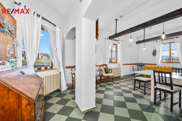 V přízemí, vedle hlavního vchodu se nachází společenská místnost, která dříve sloužila jako restaurace. Některé původní prvky tohoto využití zde byly zachovány a tak je možné takový provoz obnovit či využít k různým společenským akcím a teambuildingům. Dominantou této místnosti je krb, který v chladnějších měsících navozuje jak teplo, tak příjemnou atmosféru. K dobré obslužnosti napomáhá menší, částečně vybavená kuchyň, která na tuto místnost navazuje.