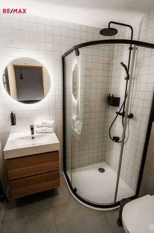 Dále je zde zádveří s úložnými prostory na míru, technická místnost, koupelna se sprchovým koutem a toaletou.