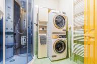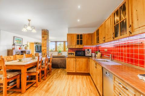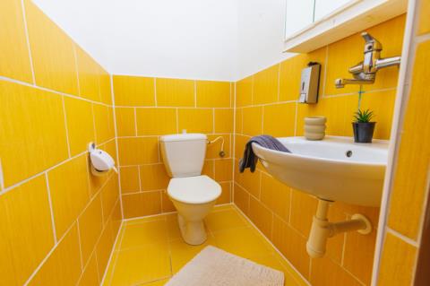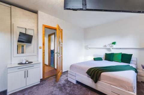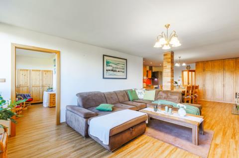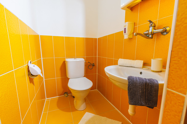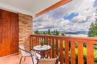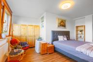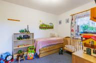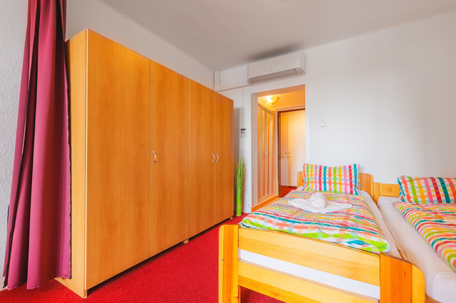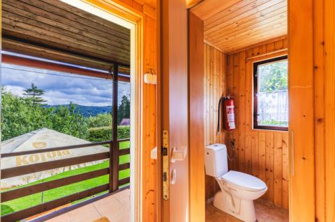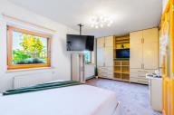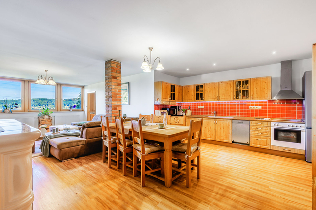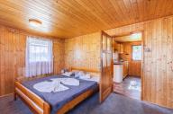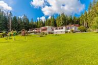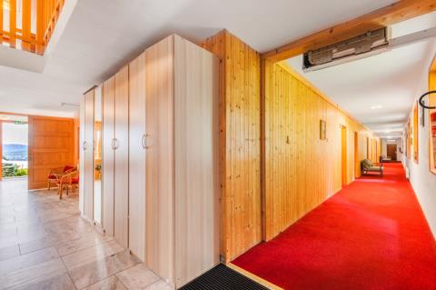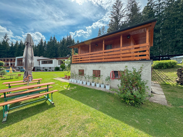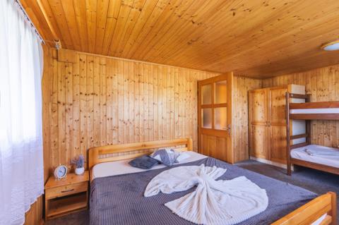 Stávající dispozice umožňuje ubytování až pro 64 hostů ve 15 stejných čtyřlůžkových pokojích, každý s vlastním sociálním zázemím a balkonem orientovaným do krajiny. Součástí areálu je také samostatný apartmán, který je nyní využíván pro personál, ale lze jej jednoduše upravit pro další hosty. Celková užitná plocha objektu přesahuje 1 200 m², parkovací plocha pojme přibližně 20 automobilů a celý areál působí čistě, udržovaně a připraveně k provozu.